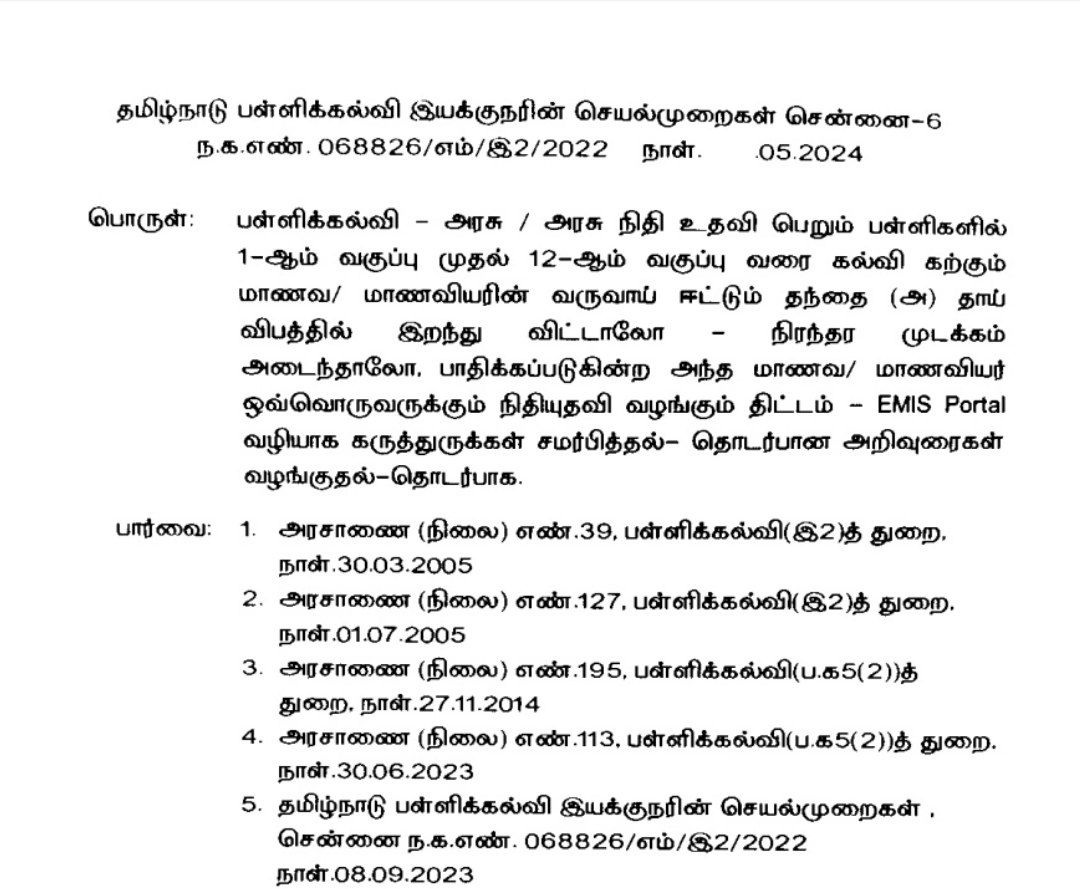 வருவாய் ஈட்டும் பெற்றோர்களை இழந்த குழந்தைகளுக்கான உதவித்தொகைக்கு எமிஸ் இணையதளம் மூலம் விண்ணப்பிக்கும் நடைமுறைகள.. பள்ளிக்கல்வி இயக்குநர் அறிவுரைகள்